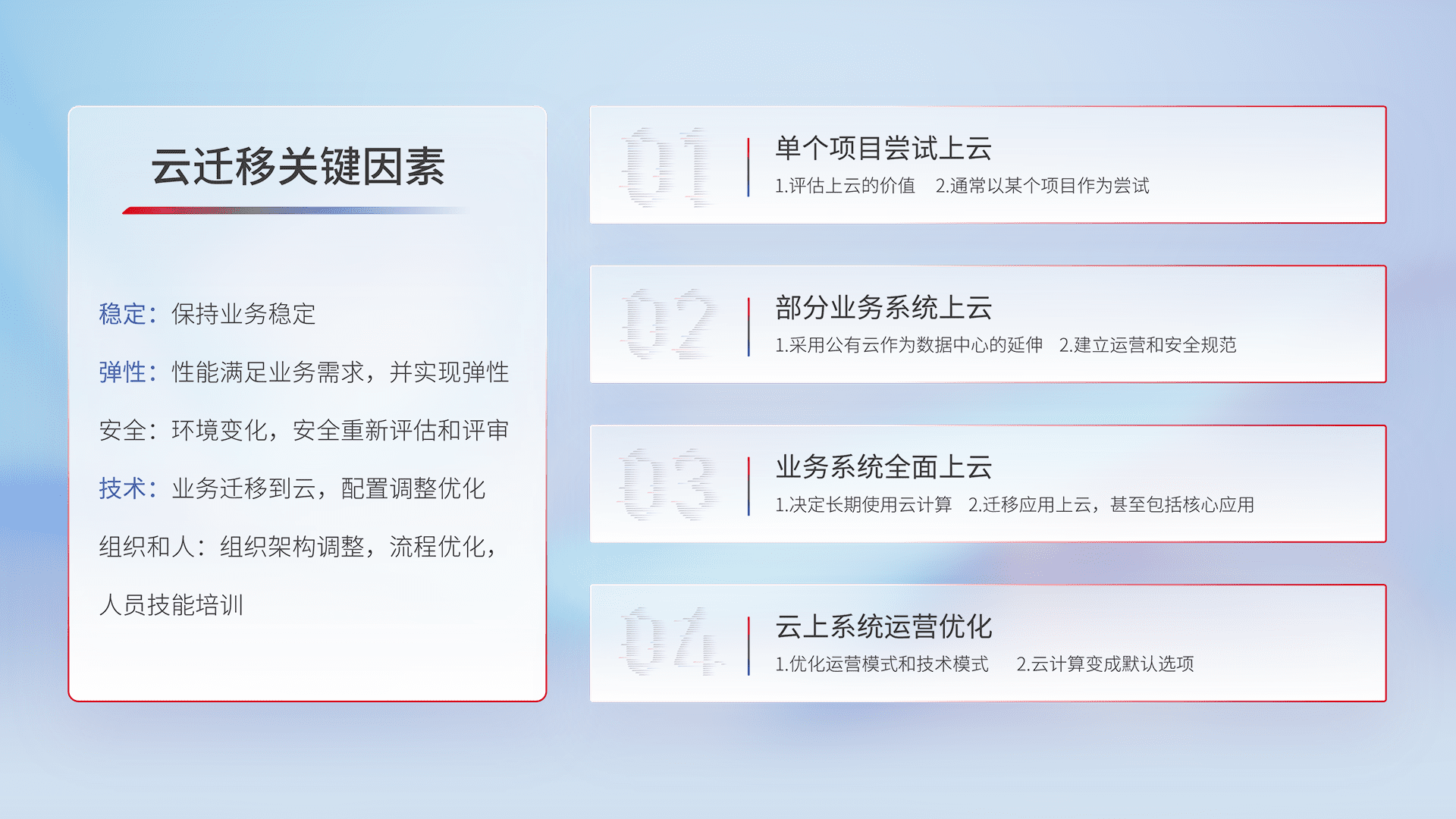 结合实际业务,,,,从规划设计、、云平台选型、、云原生改造、、、、数据迁移、、集成交付,,,,迁移全过程为客户识别最佳上云路径,,做好风险识别管理,,设计网络架构、、身份权限、、安全审计合规、、、操作审计、、、、日志审计、、监控告警策略、、多站点容灾设计等,,对云上基础设施进行整体规划,,,,提升IT治理水平,,以满足弹性、、、高可用、、高性能的需求。。。。