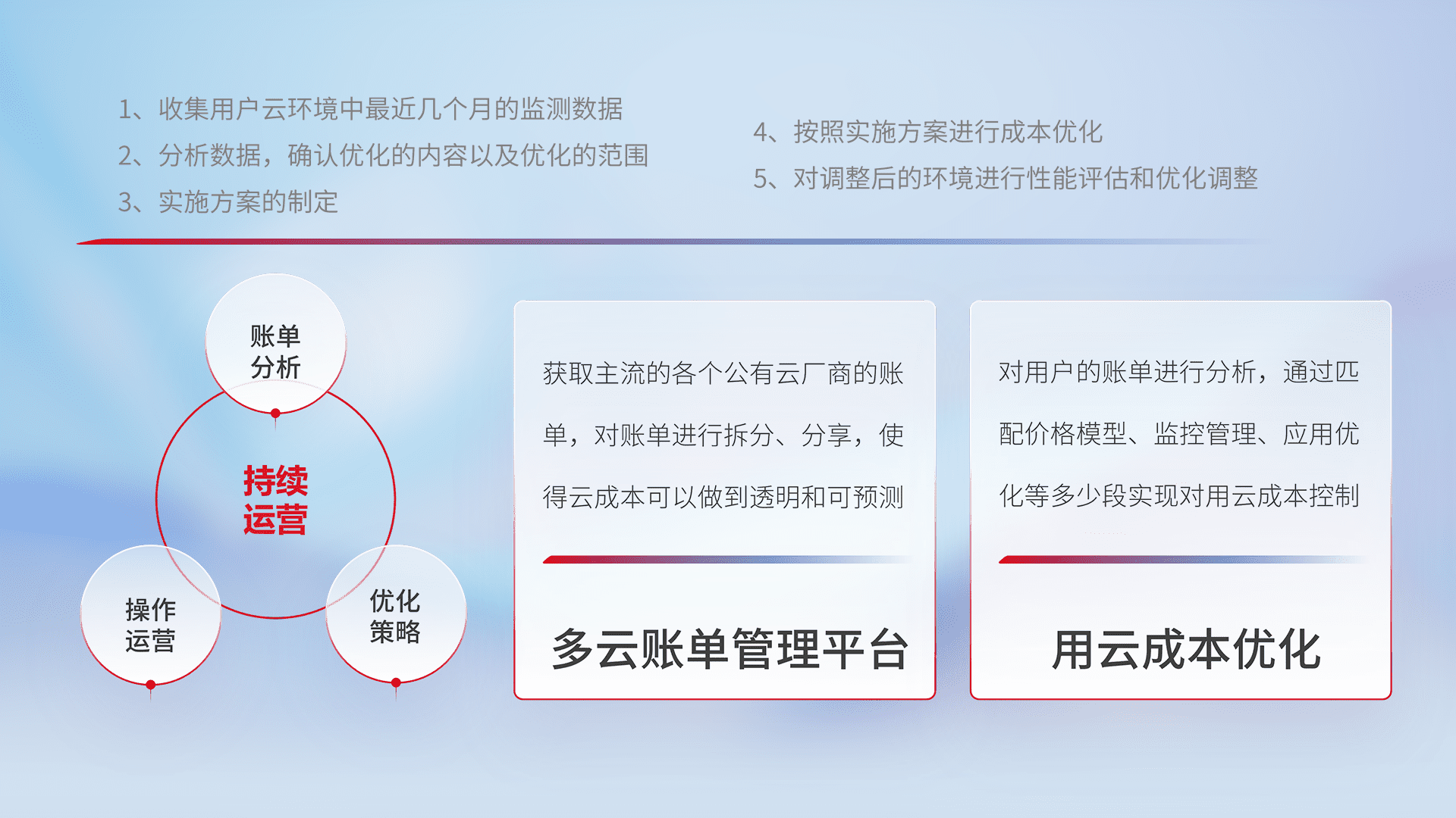 通过多云纳管,,,,以统一的资源数据模型把客户的云资源进行抽象和封装,,,,进而实现对多云资源的统一操作,,保障云资源管理的可靠性、、、稳定性与可用性。。。量身定制化运维内容,,,,配置、、开发运维、、、补丁管理、、、、备份、、、、监控、、、、认证和访问管理、、、、审计和日常巡检等,,,,保障在用云过程中的可靠度,,,,稳定度以及高可用率。。。。